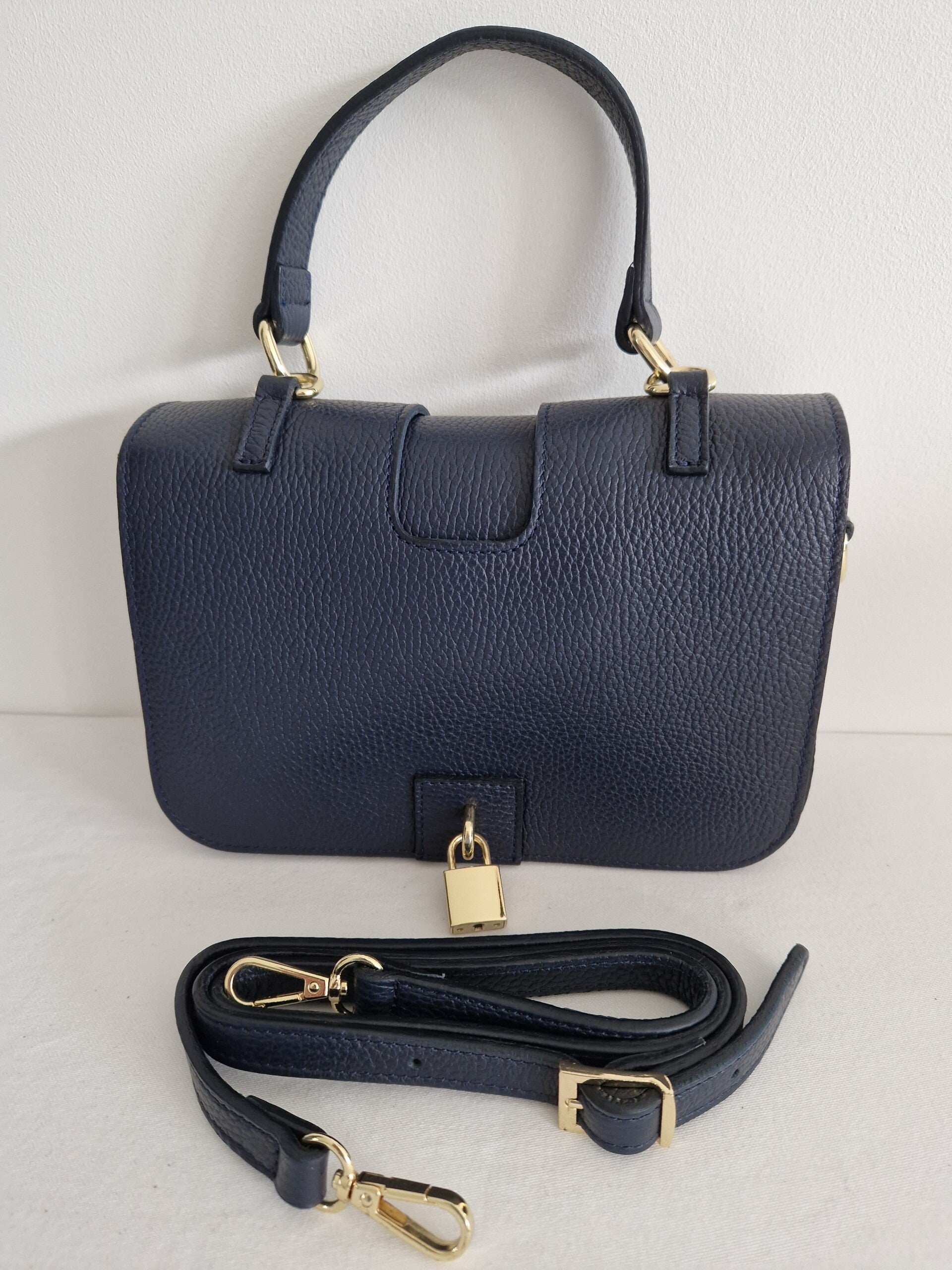 Sac à mainMatière: cuir dollarCouleur: bleu marineRabat et clip cadenas déco, bandoulière réglable et amoviblefermeture éclair, poche intérieure zippée, quincaillerie doréeL: 25cm, H: 13,5cm, P: 6,5cmRéf: 1172