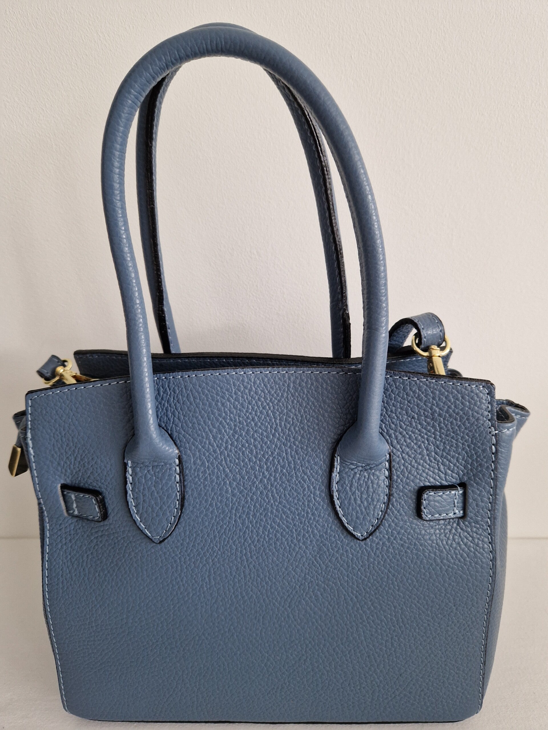 Sac à main Matière: cuir dollar Couleur: bleu clair Bandoulière en cuir réglable et amovible Fermeture éclair à tourniquet décorative Poche intérieure zippée et 2 poches pour téléphone portable Quincaillerie dorée L: 24,5cm, H: 17,5cm, P: 12cm Réf: 1175